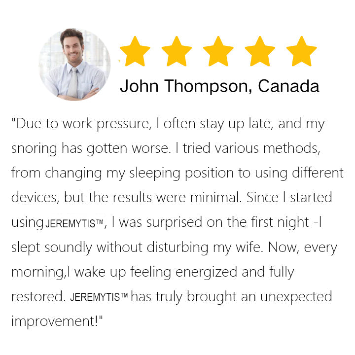 l understand the profound impact snoring has on both health and quality of life.l've seen countless patients struggle with snoring, but JEREMYTIS™has been able to providerelief. This product's innovative design not only effectively targets the root cause of snoring but also ensures comfortand improves sleep quality.After conducting comprehensive clinical trials with my team,l am confident that JEREMYTIS™ is one of the most advanced and effective solutions available.l highly recommend it to all patients suffering from snoring and those seeking to improve their sleep."